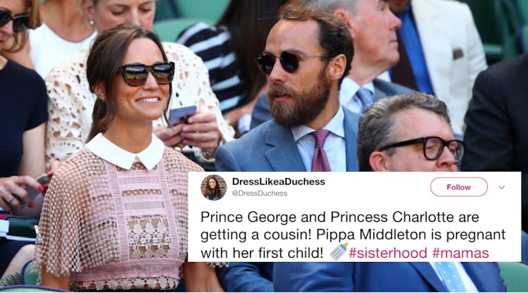The Sun, a U.K. publication, broke the pregnancy news on Sunday, and the paper relayed that Pippa Middleton and her husband James Matthews have reportedly shared the exciting news with friends and family. Pippa is the younger sister of Kate Middleton, who is, of course, married to Prince William, and the royal couple is set to welcome their third child this month. Middleton must have been excited to share the news of her reported pregnancy with her older sister, since The Sun reported that Kate was the first to learn the news from the couple. She apparently "could not have been more delighted" to hear it. Elite Daily reached out to Kensington Palace for comment but has not heard back at the time of publication.