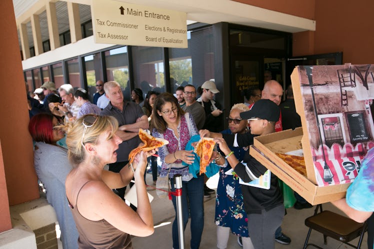 As of the afternoon of Nov. 6, polling places around the country are reporting long lines and trouble with voting machines, among other issues. In some places, the problems are so bad that some people are reportedly leaving without voting, while others are waiting hours. So basically, everyone who's standing around wet, grumpy, and late getting back to work while waiting to cast their ballot would probably really appreciate some pizza.