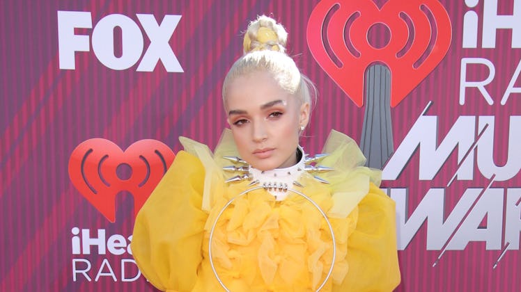 If you didn't already know who the singer Poppy is, you probably should, especially since Poppy's 2019 iHeartRadio Awards Dress is as wild as she is. Poppy's dress was designed by Viktor & Rolf and was just featured on the spring/summer runways this season. The couture gown was just one of the many moody dresses featured on the Viktor & Rolf SS19 runway most recently. With bright yellow tulle featuring the words "Go To Hell" underneath a skull on fire, Poppy's iHeartRadio dress was definitely a bold choice for the red carpet.