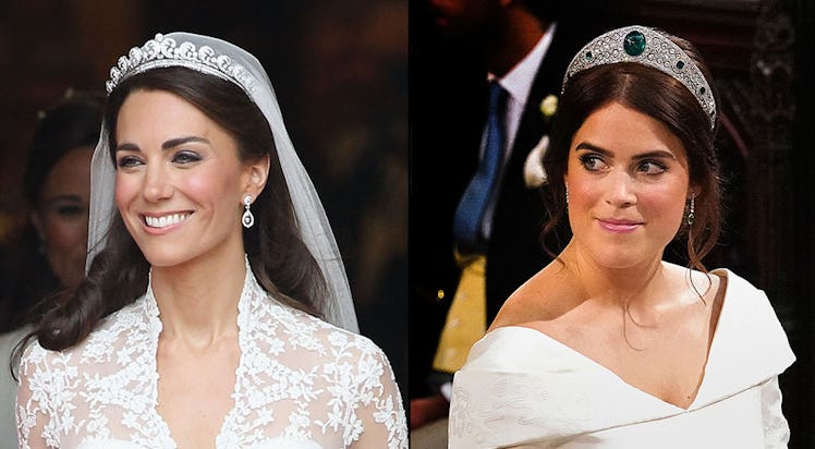The "Greville Emerald Kokoshnik Tiara," according to PEOPLE, is part of the queen's collection, lent to her granddaughter for the wedding day. It features brilliant- and rose-cut diamonds pavé set in platinum, along with those eye-catching emeralds. They really bring out the green in Eugenie's eyes, so it's a total match made in heaven. Kate and Meghan's tiaras had only diamonds (only diamonds, can you imagine?) and no colored jewels, so Eugenie's emerald headpiece made an extra-special statement.