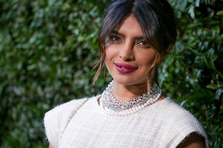 First things first, let's give credit where credit is due: Chopra is most definitely wearing an updo similar to the classic Meghan Markle messy bun in this photo. It's so similar to Markle's wedding day look, and in fact, not unlike the bridal vibes Princess Eugenie served a few months ago, either. I mean, that middle part! The wavy tendrils framing the face! The lengthy veil! Patterns, people!