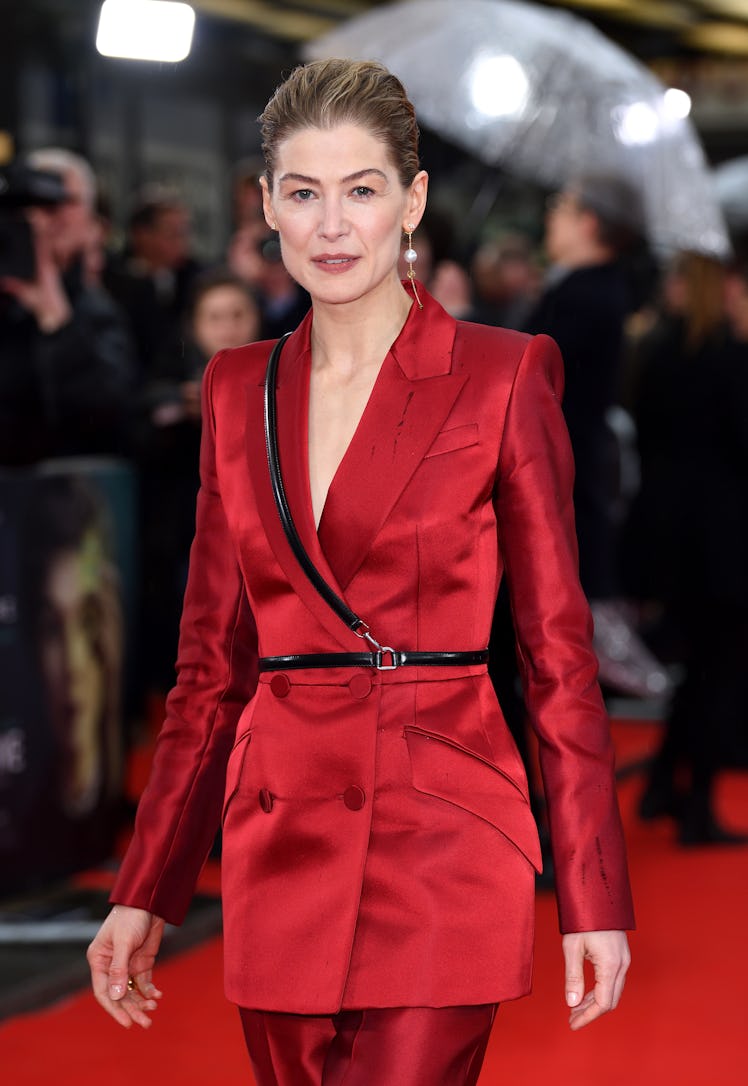 Even from a hotel far from the red carpet, Pike looked flawless. Her voluminous dress gave off serious Lydia Deetz from Beetlejuice vibes. The bodice is ruched with two bows tied asymmetrically on it and some black stitching details. While this dress is beyond exciting in its own right, the way Pike styled it was very edgy and unconventional for an award show. Rather than a pair of heels, the actor wore shiny, black combat boots, and as Pike's dress ended at her ankles, the boots were on full display. For her hair, she styled her blunt bob pin-straight. Pike's makeup is relaxed; she went with a red lip to match her gown and soft eye makeup.