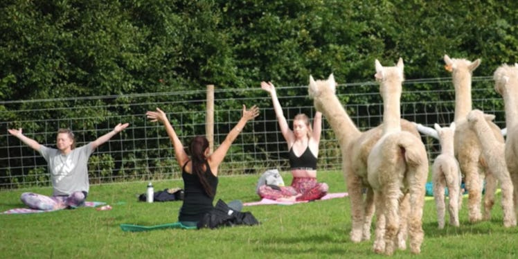First came the cosplay-style yoga practice known as Harry Potter yoga. Then came the explosion of goat yoga. Now there's an entirely different style of animal-accompanied yoga, however, which is most commonly known as alpaca yoga. It originated on the Rosebud Ranch in Umberleigh, Devon, in England, per the Rosebud Ranch website, and if you ask me, it's well worth a lengthy trip across the pond.