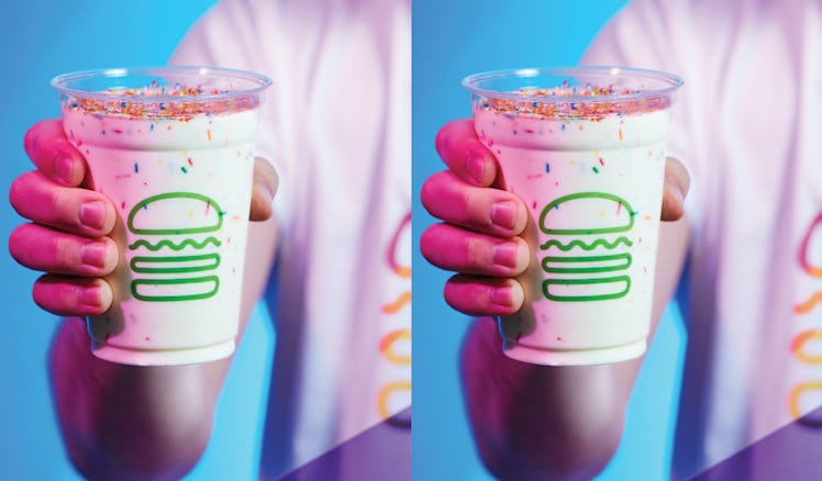 For the second year in a row, New York City's beloved burger chain, Shake Shack, is — once again — offering its famous Pride Shake. If you weren't able to try the Pride Shake last year, it features a cake batter milkshake blended with rainbow glitter sprinkles, per the company. Yep, you heard that right, folks — not only does it feature every color of the rainbow, but it's also decked out in sparkles. You can snag one for yourself in-person, via the Shack app, or on the Shake Shack website at all U.S. Shake Shack locations (which excludes stadium, ballpark, and airport locations), between June 1 and June 30 for $5.69 each. If you ask me, it definitely knocks any old unicorn drink out of the park.