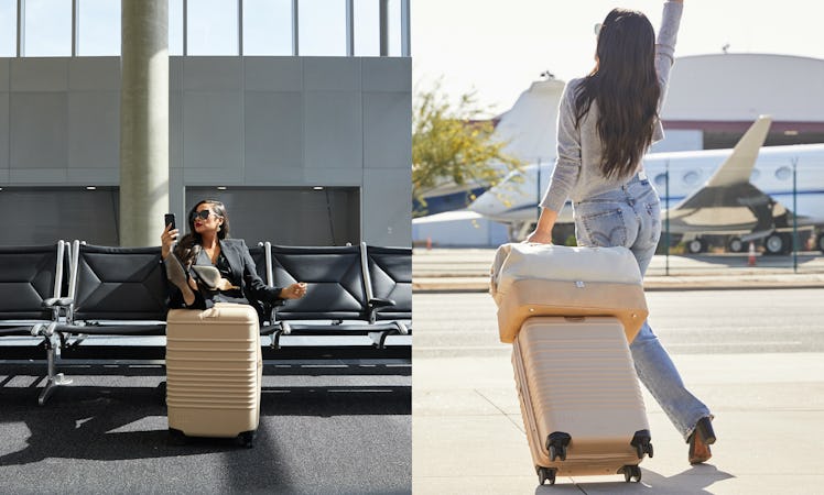 The spinning luggage comes in two different sizes — a carry-on ($198) and a large checked bag ($258) — in the brand's two signature colors, beige and black. Both bags come complete with a variety of features, including: water-resistant zipper tape, 360-degree wheels, a cushioned handle, a weight indicator handle, TSA-approved locks, and a zippered expansion. The outsides of each roller is hard-sided with a simple, but sophisticated, horizontal line design, which is absolutely perfect for your airport pics.