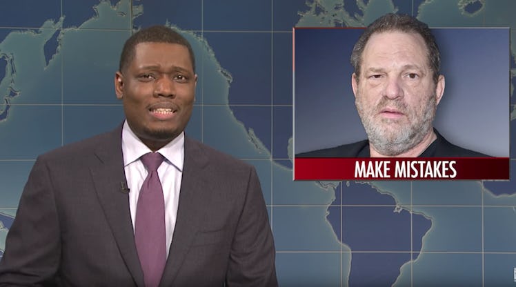 Harvey Weinstein has made plenty of headlines in recent weeks, but he hasn't been the brunt of jokes on SNL until Oct. 14. After being criticized for ignoring sexual assault accusations against the Hollywood exec., everyone's favorite late-night comedy show finally decided to tackle the sensitive issue. SNL responded to the Harvey Weinstein allegations and certainly made up for its silence on previous episodes.