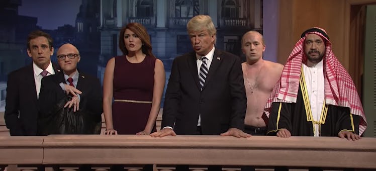 Things then start to get a little juicy. Baldwin's Trump gets on a call with the POTUS' former lawyer, Michael Cohen (played by Ben Stiller), where he asks why Trump made him do "so much illegal stuff." Referring to Cohen's guilty plea on Thursday, Nov. 29, in which he admitted to making "false statements to Congress" in regard to the plans for a Trump Tower deal in Moscow, Russia during the 2016 presidential election, per The New York Times. Elite Daily reached out to Cohen's representatives for comment, but did not hear back in time for publication. Even with no set plans for a build in Russia, this news could potentially establish that Trump did, in fact, have financial interest in Russia at the time. Oh, well. The White House did not immediately respond to Elite Daily's request for comment on Cohen's plea deal.