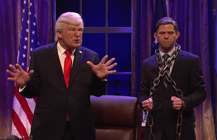 President Donald Trump and his administration gave SNL a lot to work with this week, and the late-night show totally took advantage during its Dec. 2 cold open. What was intended to be a festive holiday party at the White House — complete with Melania's "dead branches and mysterious shadows" for decoration — turned out to be a hellish ordeal for the commander in chief. SNL's Trump Christmas party was actually more of a nightmare... for the president, anyway.