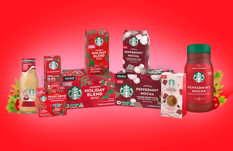 The coffee chain unveiled its at-home holiday offerings on Monday, Oct. 12, which is the same day they began rolling out nationwide to grocery stores. One of the options making a comeback is Starbucks' Instant Peppermint Mocha Latte, which is inspired by the brand's winter menu item and blends of real milk with 100% arabica coffee. You can get a 5-count pack of the instant beverage for $7.99. Starbucks Peppermint Mocha Iced Espresso Classic, which features espresso, milk, and flavors of peppermint and chocolate, is also back this year. A 40-ounce bottle will cost you $4.99.