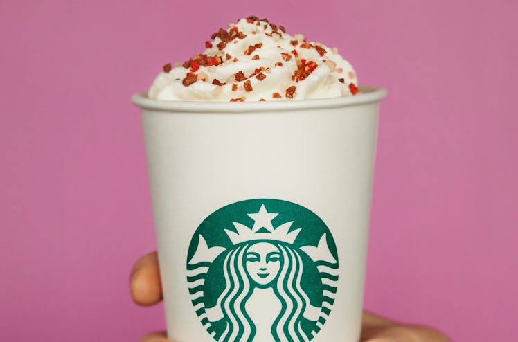 So, what gives a Cherry Mocha its chocolate-covered cherry taste? According to Starbucks, it's the sweet mocha sauce and candied cherry syrup. To make the drink, baristas pour hot espresso over the mocha sauce and cherry syrup. Then, they add steamed milk, and top it off with whipped cream and Valentine's Day sprinkles. How cute, right?