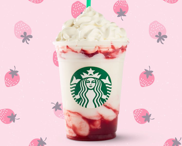 Before you get too caught up with how the drink looks, let's talk about what it's actually made of. According to a press release, Starbucks' Serious Strawberry Frappuccino is a layered drink (similar to its Ultra Caramel and Triple Mocha Frappuccino counterparts). Unlike the others, though, the Serious Strawberry starts with a swirl of strawberry fruit puree. After the puree is in place, Starbucks' "new and reinvented" Strawberries and Crème Frappuccino is poured on top. (For those of you who are wondering, the frappuccino portion of the drink is made of ice, milk, and Starbucks' strawberry infusion blend.) After the Strawberries and Crème Frappuccino is in place, the drink is topped off with strawberry puree and vanilla whipped cream. As someone who loves strawberries, I cannot wait to try it.