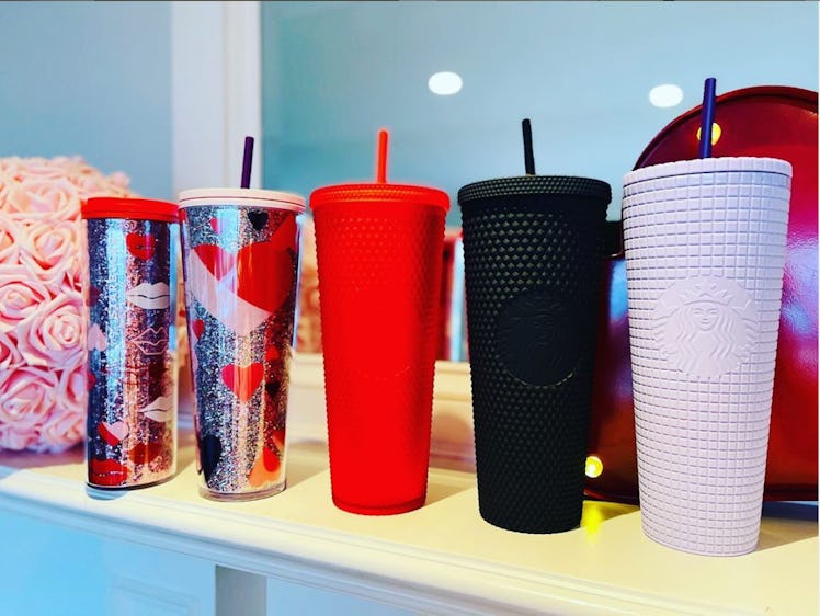 According to comments on Instagram posts of the new merch, Starbucks kicked off 2021 by rolling out its latest lineup of rotating cups, sippers, and tumblers for V-Day on Jan. 5. Elite Daily reached out to Starbucks for more information on the new Valentine's Day drinkware, but the company was unable to provide further information at the time of publication. With just under a month to go until Feb. 14, customers can once again fuel their love of caffeine with a variety of more traditional glitter lip and hearts-embossed designs as well as some sleek offerings that stray from the traditional motifs of the holiday.