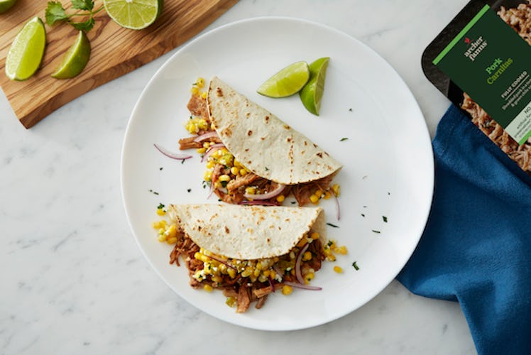 This bad boy calls for Archer Farms' Mexican street corn salad, pork carnitas, a little cilantro if you're feelin' the herb, and some tortillas. That delicious meal couldn't possibly take more than, like, 10 minutes to assemble, so you'll be pressing play on Netflix and enjoying your dinner in no time, my friend.