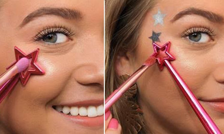 But now, with this genius hack using Tarte's Limited Edition Pretty Things & Fairy Wings Brush Set ($42; tartecosmetics.com), you can get the look of colorful face tattoos without having to put a sticker so close to your eye (because, ouch!). All you do is choose your star size (the powder brush is the biggest, and the eye shadow brush is the smallest), place it on your face, and use a small brush and your favorite shadow color to fill in the space inside the star.