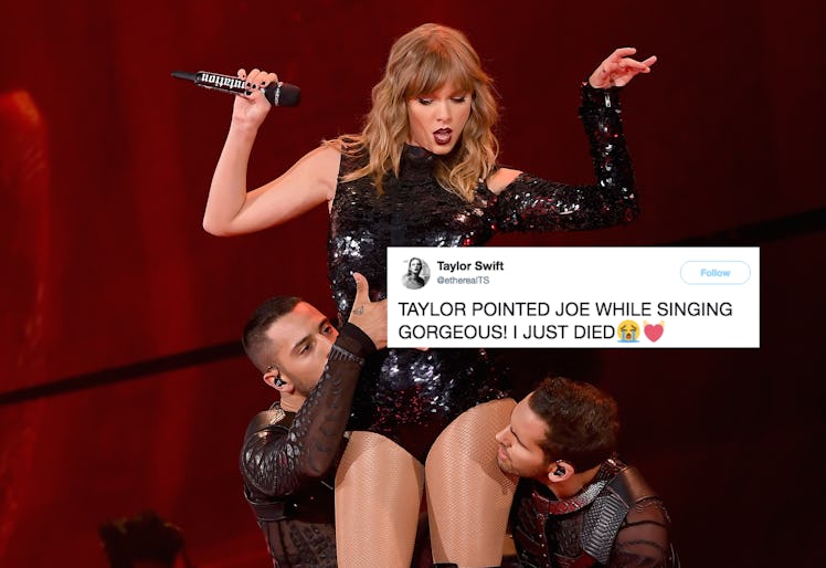 Taylor Swift's Reputation Tour had its opening night in Glendale, Arizona on Tuesday, May 8, and if you were on Twitter for even half of a second today, you probably saw some of the fan reactions to the performance. Some of the biggest things fans were talking about following the concert was the fact that she sang "All Too Well" (a fan and critic favorite) and "Gorgeous," a song about her longtime boyfriend, actor Joe Alwyn. What's more, he was in the audience at Glendale, and Taylor Swift sang to Joe Alwyn during her concert. No, Swift's fans on Twitter could not handle it at all.