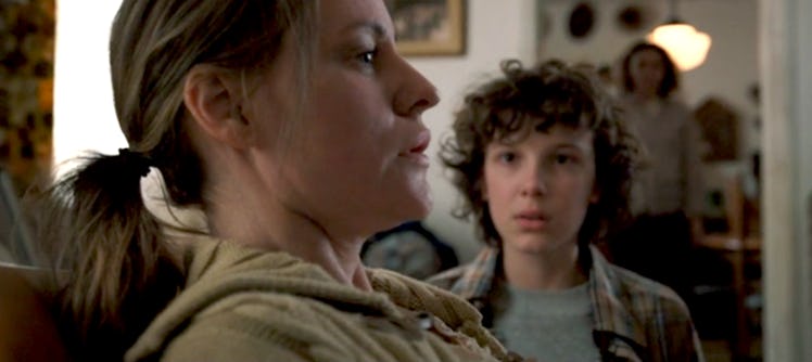 However, Eleven doesn't find her mom in the condition she was hoping — her aunt Becky leads her into the living room where Terry is sitting motionless on a chair robotically repeating the same few words: "Breathe. Sunflower. Rainbow. 450." Becky explains that Terry is basically stuck in a dream-like state, but Eleven notices something that gives her hope. As the lights begin to flicker, Eleven realizes that her mother also has psychic powers, and she decides to use her ability to enter Terry's mind.