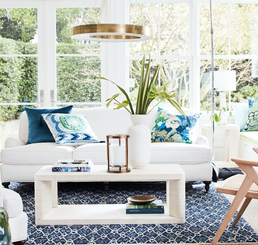 This modern living space background from Williams-Sonoma brings together white, blue, natural wood, and copper, but the best part is the view of all the outdoor greenery.