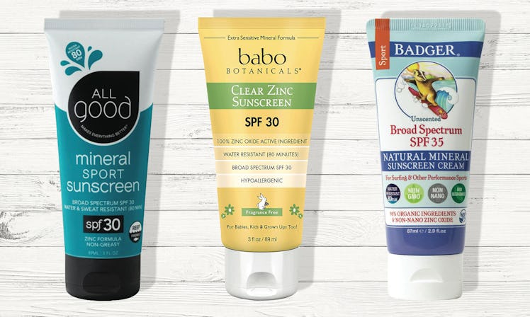 This Badger Sport Sunscreen Cream with SPF 35 contains only five ingredients: non-nano zinc oxide, organic sunflower oil, organic beeswax, organic jojoba oil, and tocopherol (aka vitamin E). It's fragrance-free, water resistant up to 80 minutes, and biodegradable, and boast's the NSF's seal of approval (which means it's made with at least 98% organic ingredients). That said, like most mineral sunscreens, it may leave behind a bit of a white cast, so you'll want to rub it into your skin really thoroughly.