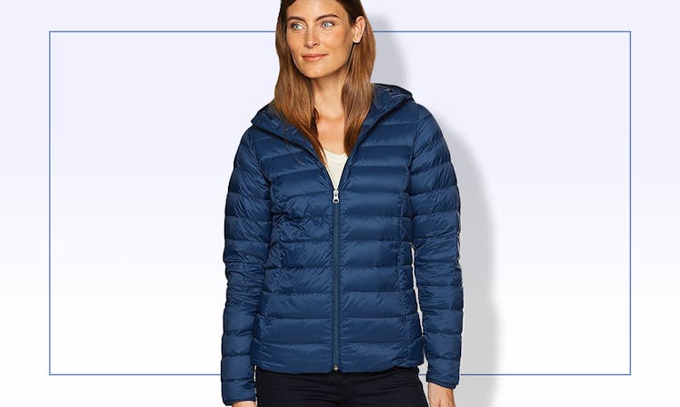 Another decently affordable option, Amazon Essential's hooded down jacket is has a barely-there feel. With a slim fit that ends just above the waist, this option is made with cozy duck down and a quilted nylon outer shell that's both durable and water-resistant. It also comes with an attached hood, two side pockets and elasticized sleeves.