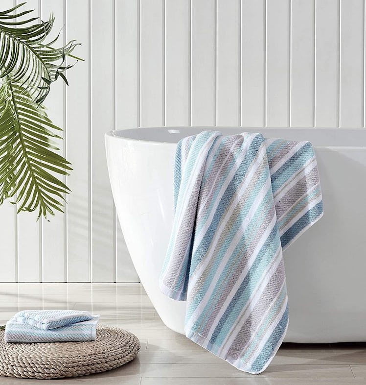 With their neutral color scheme and chic striped print, these Tommy Bahama towels, which have a GSM of 600, will transform your bathroom decor. The medium-weight towels are made of 100% cotton and have a twisted texture that adds to their stylish feel, and though they’d look good in any home, they feel especially well-suited to warm climates. If you don’t love the colors pictured, they also come in light blue and mint green colors.