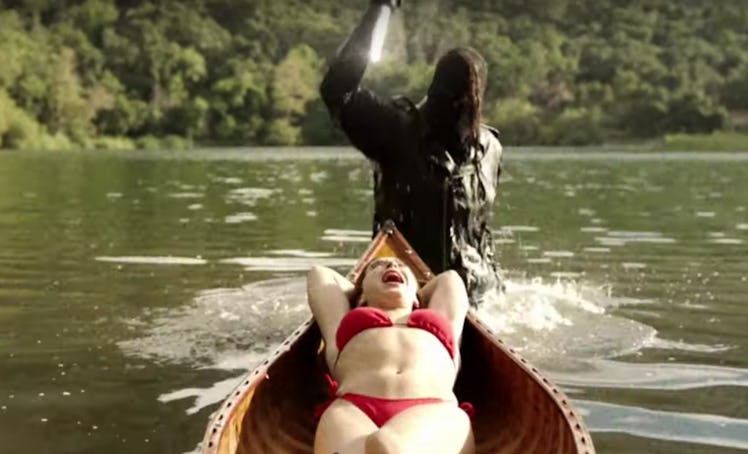 The second scene shows a group of campers playing at a lake, when suddenly the assumed killer jumps out of the water to stab a woman lounging in a canoe. Check out the full teaser trailer below:
