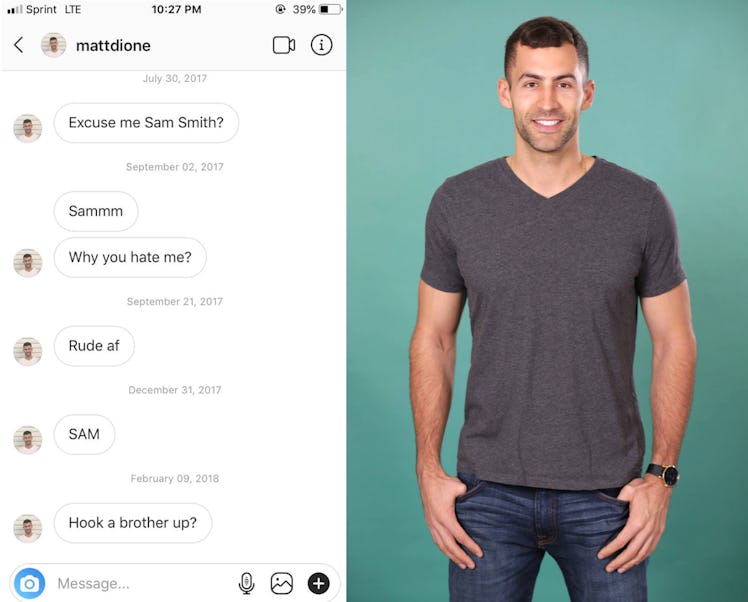 The new season of The Bachelorette hasn't even started yet and there's already drama. What sort of drama, you ask? Well, for starters, The Bachelorette contestant Matt Dione slid into Sam Smithburger's DMs for nearly two years. Smithburger, an Orlando, Florida-based Twitter user, has posted all of the screenshots on Twitter for the world to see.