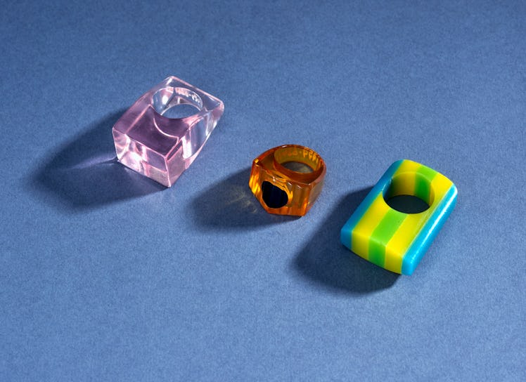 I've been growing my ring collection as of late, and in my pursuit of a blingy hand, I've noticed one trend popping up on everyone else's hands. The dainty jewelry trend of 2020 is no longer the move. Instead, chunky, acrylic rings are the new jewelry trend to get into in 2021. They're graphic, vibrant, and a sweet throwback to classic '90s style and accessories. Just picturing them reminds me of watching my mom get ready for a cocktail party. Luckily, as 2021 continues, the accessory has made a swift entrance into everyday wear.