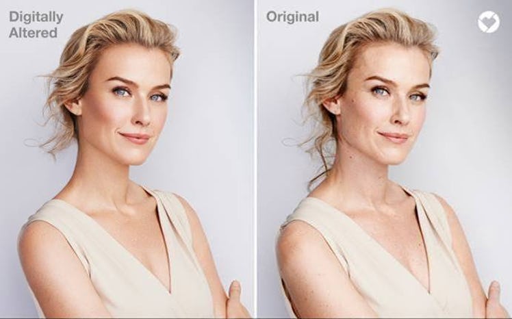 Airbrushing and Photoshop are open secrets in the beauty industry by now. Countless actresses and models have posted enough side-by-side photos illustrating the differences between original and enhanced images that you likely already know that what you see in magazines isn't 100 percent real. That doesn't stop you from wondering why altered images would be the industry standard when it comes to selling beauty products to real people. It turns out that you're not the only one questioning the practice, and now the CVS Photoshop ban is making a significant upgrade in the beauty aisle.