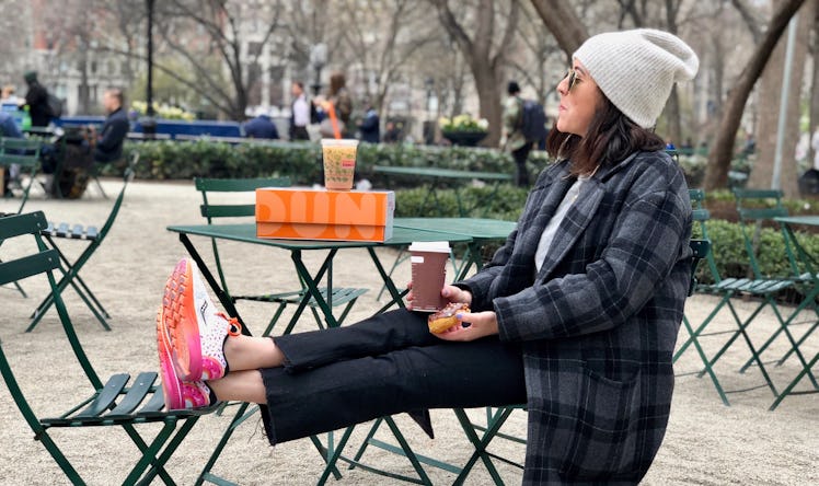 Obviously, I had to get some Dunkin' Donuts coffee while wearing my Saucony x Dunkin' Kinvara 9 sneakers, because how could I not? I couldn't choose between iced and hot, though. It's a lifelong dilemma. But what's better than one coffee? Two coffees.