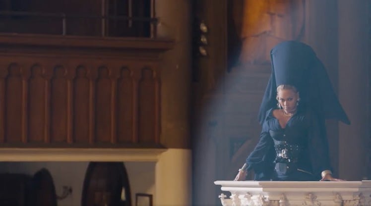 Aside from the shots in the confessional, there are little shots of JAY standing in a suit near the altar, looking anxious, while Beyoncé stands, in domination, in the pulpit (the raised podium from which the priest delivers a sermon — get your church architecture game on).