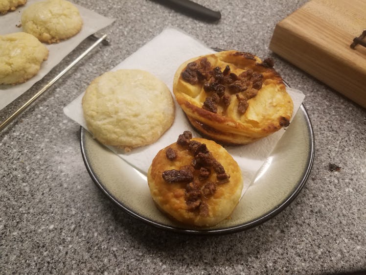 The recipe says the prep work takes five minutes, though even with a modern stand mixer, mine took slightly longer. What the recipe doesn't tell you is that the dough is startlingly dry. I thought I'd done it wrong at first, but no. It turns out the medieval cook would have relied on the kitchen being humid and having damp hands. Once I opened my back door and let some moisture in, not even five minutes, the dough began to magically become cookie dough.