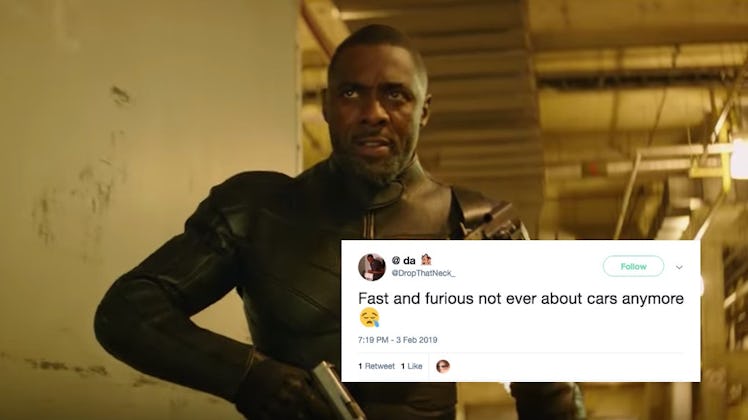 Maybe you didn't believe me when I said the Hobbs and Shaw trailer caught my eye during the Super Bowl, but I mean it, y'all, and it was all because of one person: Idris Elba. Elba's new to the Fast & Furious movie scene, and according to Variety, he'll make his debut in the franchise as the main villain in Hobbs and Shaw. Basically, the plot of the film will have special agent Hobbs (Johnson) and "criminal mastermind" Shaw (Statham) set aside their own apparent hatred for one another so they can try to defeat Elba's character. Cute storyline, right? Just two muscular dudes who live crime and stuff, getting past their differences so they can ~fight against evil~ and ~save the world.~ I'm still a bit fuzzy on where/how/if cars, race-car driving, etc. come into the whole thing, but I guess that's just TBD? I'll let you know.