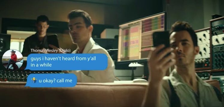 The JoBros then got all pretend-mad, naturally. But we now know the whole thing was either A) just a big PR stunt to hype "Lonely," or B) a means to connect for an epic collab track — which, it turns out — is a pop-y, twangy trip down a long, dusty country road. One that apparently has great cell service. Can someone find out who their carrier is? K thx bye.