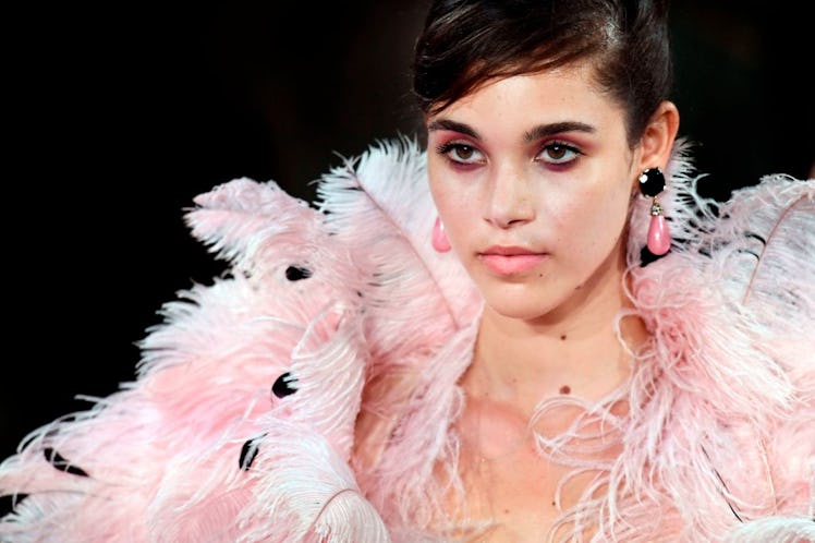 Mermaid eyes (those swept with turquoises, blues, and greens) might be the shadow trend of summer 2018, but for fall it's all about the super sweet rosy hues, and lots of them. At Giorgio Armani Privé, Christophe Josse, and Ralph & Russo, bright pinks heavily clouded eyelids and were pulled around to line bottom waterlines. Giorgio Armani Privé paired its blush-swept eyes with black eyeliner for a bit more definition, while powder pink lips further added to the sugary look.