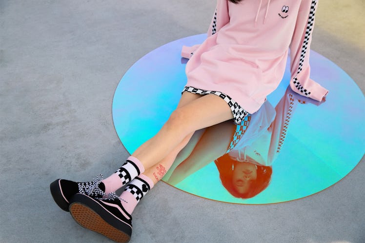 Speaking of, the non-sneaker offerings also rule. There's a light pink hoodie with white and black checked stripes running up either arm, and a set of eyeballs over Vans' "Off The Wall" slogan on the back. If you prefer that in long-sleeved shirt style, you're in luck. There's also a range of socks, a mini skirt, an adorable baseball cap, and even a dress — the collection basically includes half of a wardrobe.