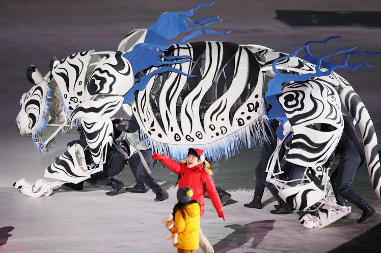 The Olympics opening ceremony went down on Friday, Feb. 9 at the ceremony was absolutely beautiful. The ceremony started off with a video of kids exploring Korea and then the feed cut to the same kids in the Olympic stadium running with huge animal puppets. The meaning of the animals in the 2018 Olympics opening ceremony pays tribute to the Korean culture and it's amazing. Some of the animals honored with puppets in the 2018 PyeongChang Olympics opening ceremony included a white tiger (the 2018 Olympics mascot), a grasshopper, a dragon, and a turtle.