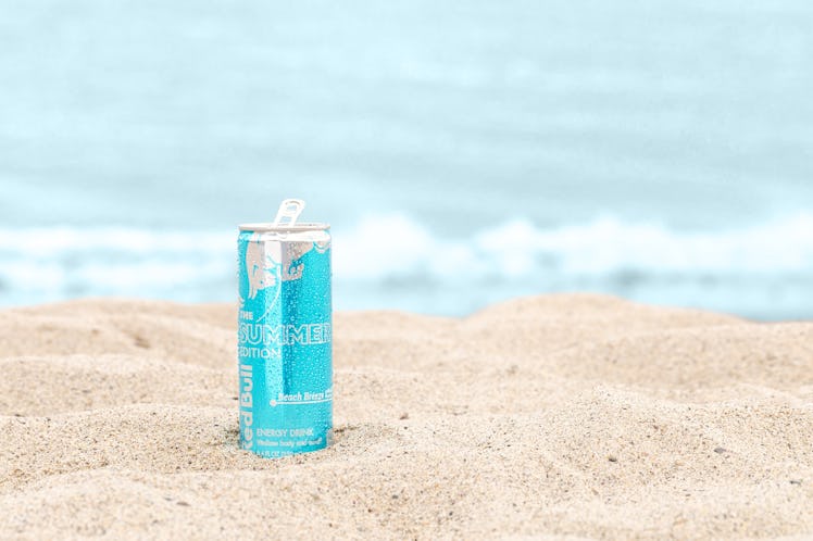 What makes the Summer Edition Beach Breeze even more desirable for those warm beach days is its can color. Instead of the original design that features shades of navy blue, silver, and red, the Beach Breeze cans are bright turquoise and reminiscent of a tropical ocean horizon. They still feature the brand's iconic bull — but instead of dueling at the center of the design, it's pictured leaping above the drink's logo (which is also in a different spot). On the can, the words "Red Bull" are placed vertically underneath the selection's name, which reads "THE SUMMER EDITION" in silver writing.