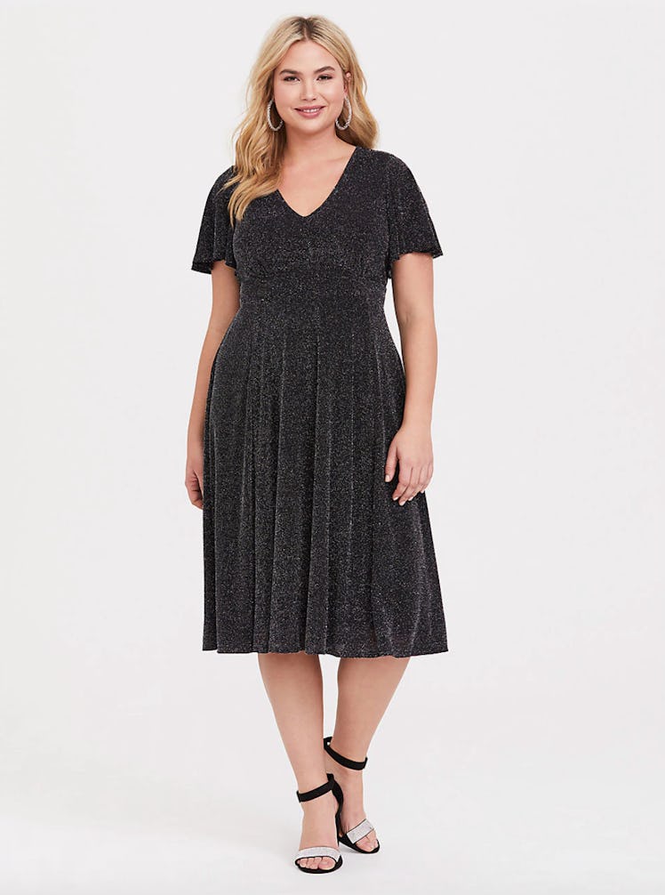 Did you just find your perfect New Year's Eve dress, or what? The shimmery fabric, full skirt, and deep V neckline all come together to create one stunning look.