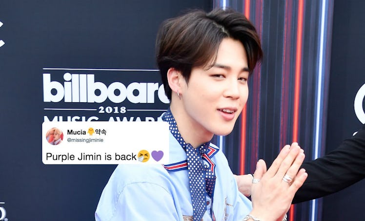 Jimin is no stranger to hair dye. The BTS sensation has changed the color of his locks more times than Kylie Jenner has changed hers. His hair's been black, brown, orange, silver, pink, blue, blonde, and lavender. And Jimin legit rocked the hell out of each hue. How one person can look so good in so many different hair shades, I'll never know. I mean, my hair's literally been the same color for the last 15 years. Anyway, after showing off a head full of cotton candy pink hair during BTS' Love Yourself tour stop in Hong Kong on March 20, the quick-change artist rolled up the next day rocking a new violet shade. And fans on Twitter are totally losing it over the amazing photos of BTS' Jimin's purple hair in Hong Kong.