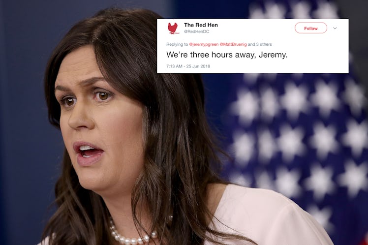It's another week, and that means there's another dumb scandal brewing on Twitter to distract you from the fact that the world is ending. To get you up to speed: White House Press Secretary Sarah Huckabee Sanders was booted from Red Hen, a restaurant in Virginia, on Friday, June 22 because the owner was uncomfortable serving someone who defends intolerant policies for the Trump administration. Sanders and President Donald Trump both tweeted about the ordeal, naming the restaurant publicly, which ignited a heated debate about whether the restaurant was within its right to do so. Now, after several Twitter users confused a different Red Hen restaurant, one in D.C., for being the one that kicked Sanders out, that D.C. restaurant is having some fun with the story. The Red Hen D.C.'s tweets about Sarah Huckabee Sanders are a hilarious bit of trolling to break up your news cycle.