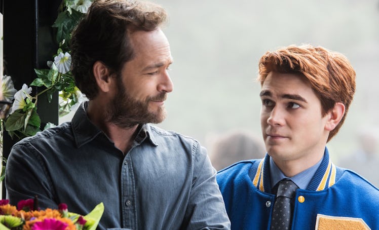 Luke Perry's death on Monday morning devastated everyone who has ever owned a television, but it hit his Riverdale costars especially hard. The actor defined the '90s by starring as high school bad boy Dylan McKay in Beverly Hills, 90210, and in the past couple of years, he returned to teen dramas, only as a dad this time. Perry starred as the loving father Fred Andrews on Riverdale, which he was still working on before his death. The Riverdale cast's reactions to Luke Perry's death are so sweet and will make every fan so sad.