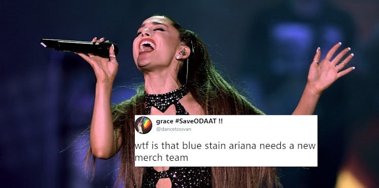 So, before I delve into the tweets, let me just explain what the deal with this particular t-shirt is. Some fans think that the blue mark or stain on the shirt looks like — how should I say this? — a certain fluid that's produced by male genitalia...? I mean, it kind of looks like that if you’re willing to let your mind go there. It seems like plenty of Grande’s fans are, in fact, willing to let their minds wander off to that place because they’re tweeting endlessly about it.