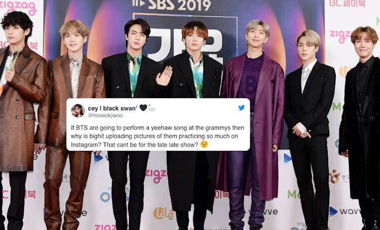It's less than a month into 2020 and BTS has already broken the internet on multiple occasions. The group first sent ARMYs into overdrive when they dropped their new single "Black Swan" on Friday, Jan. 17. Then, fans started speculating BTS was practicing for a surprise Grammys performance when they shared photos of them rehearsing choreography for the tune. Now, these tweets about BTS' rumored Grammys performance with Lil Nas X prove ARMYs just don't know what to think.