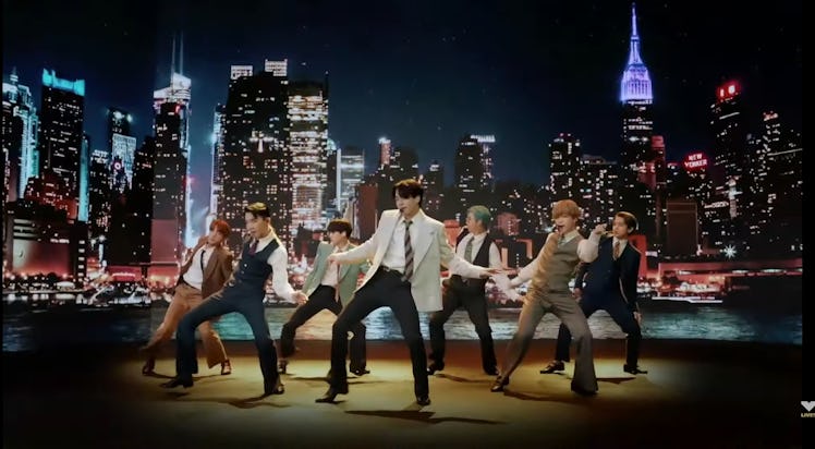 They had every reason to be excited, because BTS slayed their debut VMAs stage. They performed from Korea, but used the power of a green screen to make it look like they were actually dancing in the streets of New York City, where the VMAs took place. Fans were amazed at how unique BTS' performance was and how it referenced a few of their "Dynamite" lyrics when they sing, "Shining through the city with a little funk and soul."