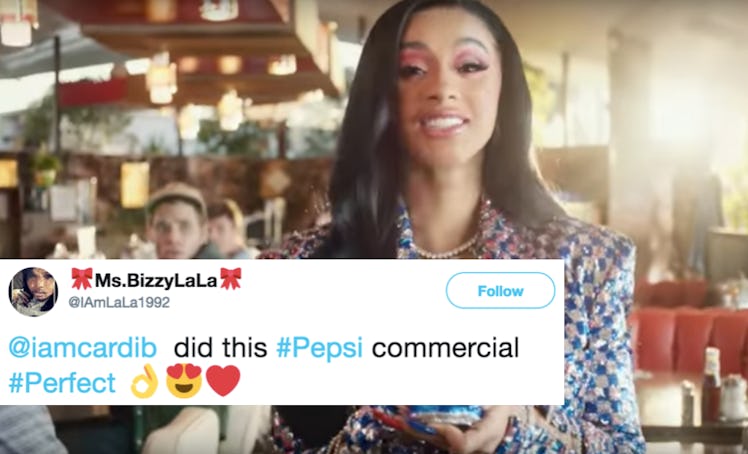 Can someone pass me a tissue? I need to wipe my tears from laughing so dang hard at Pepsi's Super Bowl 2019 commercial. If you saw the ad live, you're probably howling, too. During the segment, celebrities including Steve Carell, Lil Jon, and Cardi B make an appearance — and they all work together to prove that Pepsi is "more than OK." Actually, I should say that Pepsi is more than "OKUUUR," because that's how Cardi B famously puts it. Based off of the tweets about Cardi B in Pepsi's Super Bowl commercial, it's obvious that fans are loving her role in the ad. I don't blame them, though; she totally rocked it.