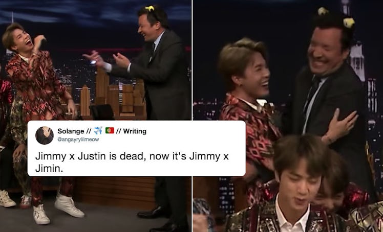 The boys of BTS made their first appearance on The Tonight Show on Sept. 25, and there was literally an ARMY of fans in the audience, some of which, according to Jimmy Fallon, had camped out in front of 30 Rock for two days to try and get in for the show. Safe to say Fallon wasn't wrong when he called BTS "the biggest boy band on the planet." Fallon had all of the boys introduce themselves to the viewers, but the crowd wasn't the only one going wild when it was Jimin's turn to say hi. The tweets about Jimin from BTS and Jimmy Fallon show that Jimmy Fallon has a new bromance brewing. (Someone warn Justin Timberlake.)