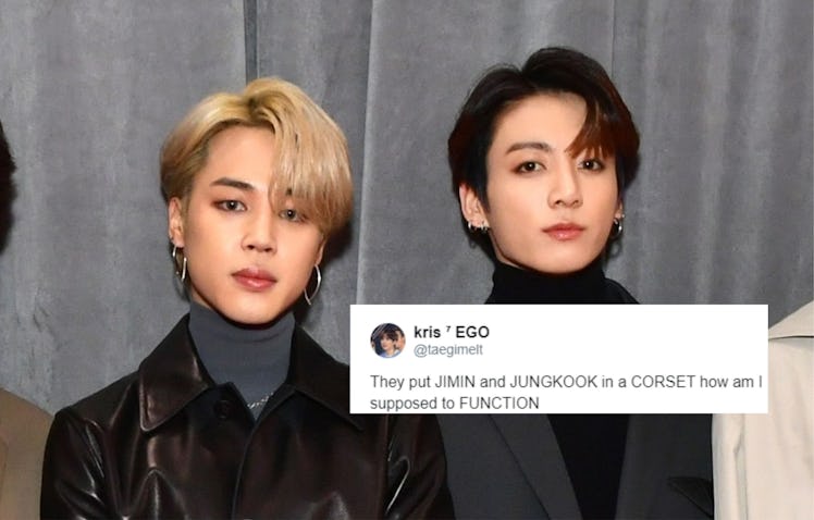 The BTS ARMY is currently enjoying phase three of BTS' comeback. In phase one and two, fans got to see the group's "Shadow" and "Ego" comeback trailers, their "Black Swan" single, and various Connect BTS events all across the globe. Each week has been jam packed with something new from BTS. As the ARMY gets closer to the group's long-awaited Map of the Soul: 7 comeback on Feb. 21, they're analyzing every detail of the boys' concept photos to theorize what they could possibly mean. But BTS' second set of concept photos have them talking about one tiny, but impactful, thing: Jungkook and Jimin's leather corsets. These tweets about Jungkook and Jimin's corsets in BTS' concept photos are all over the place emotionally.