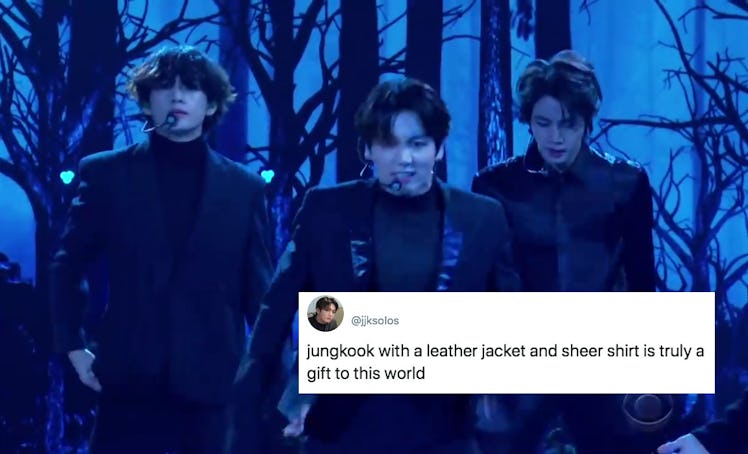 ARMYs will never be the same after BTS' debut performance of "Black Swan" aired live on The Late Late Show with James Corden on Tuesday, Jan. 28. Fans went absolutely wild over the choreography, vocals, visuals, and, oh yeah, Jungkook's outfit. These tweets about Jungkook's see-through shirt during "Black Swan" make it clear ARMYs purple the look.