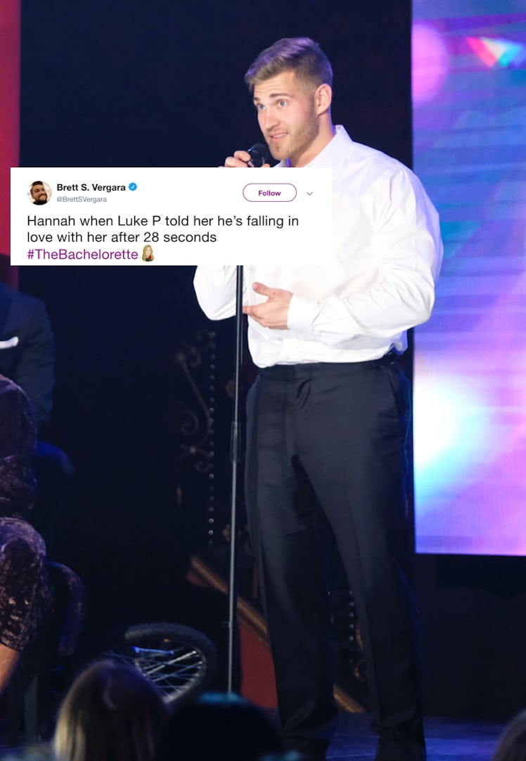 On Episode 2 of Hannah's season of The Bachelorette, she made it very clear that she's setting out to find her Mr. Right. In fact, she's so focused on her goal that she held an official Mr. Right competition with half the men vying for her heart, just to see how they all stack up against each other. Like any good pageant, the men had to compete in both a beauty portion and a talent portion. While most of the guys went with more traditional talents like riding a unicycle or singing a song, Luke P. decided to do something a bit more unconventional when it was his turn to take the stage. For his talent, Luke told Hannah that he's already falling in love with her, and Bachelor Nation has a lot of feelings about it. These tweets about Luke P. saying he's falling in love with Hannah all point out that he's moving a little fast.