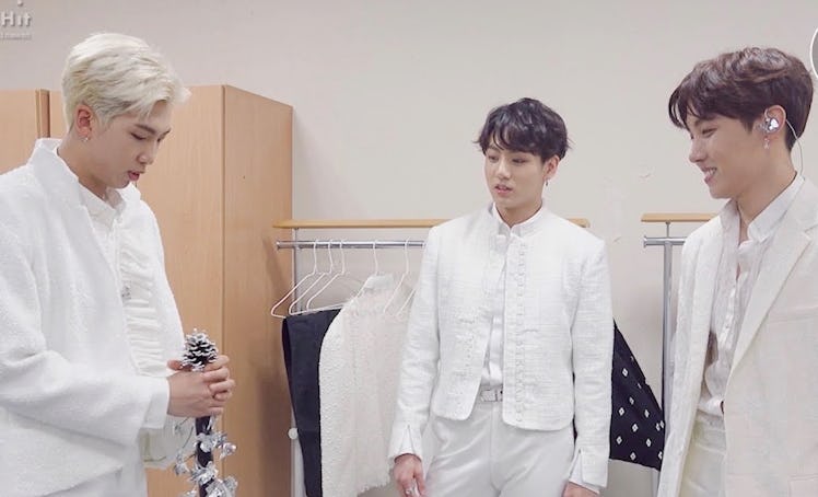 In BTS' new YouTube video, while backstage for the group's first music show performance of the track for M Countdown on April 18, RM stood in front of the mirror practicing his dance moves using the staff. Although he looked totally focused, Jungkook decided to cut in and help RM with a particular aspect of the choreo.
